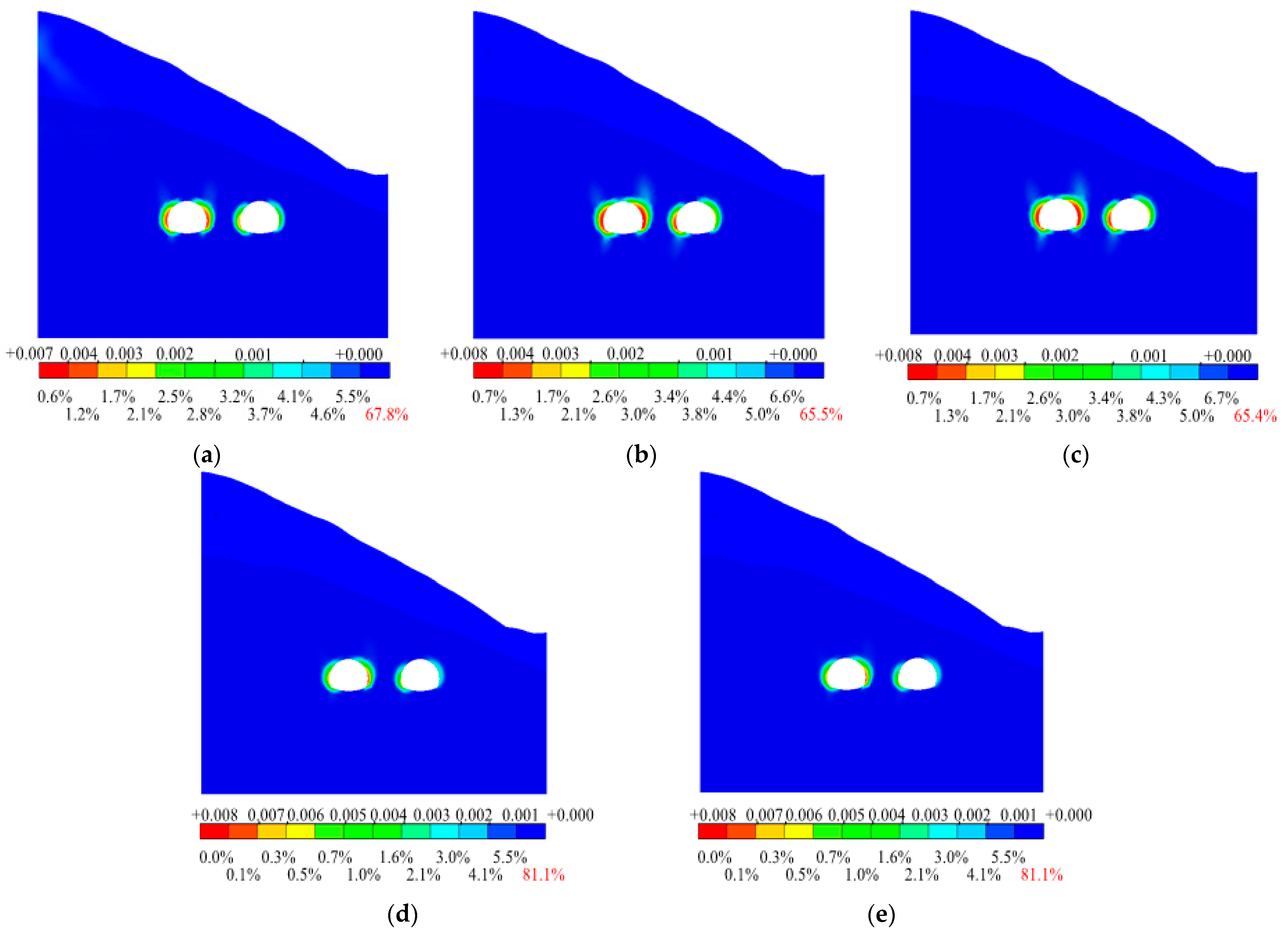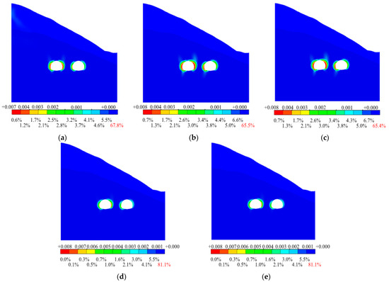 Plastic zone distribution map of the surrounding rock. (a) Face lag distance = 0.5 D; (b) Face lag distance = 1.0 D; (c) Face lag distance = 1.5 D; (d) Face lag distance = 2.0 D; (e) Face lag distance = 3.0 D.
