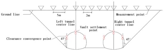 Monitoring sections were arranged at intervals of 10 m along the tunnel alignment. The vault settlement points and clearance convergence points were installed within the same cross-section, as shown in Figure 13. The monitoring frequency was determined according to Table 6, and the deformation control criteria for field monitoring are provided in Table 7.