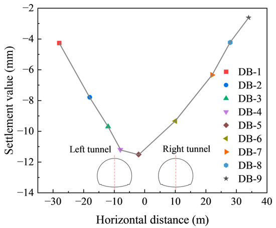 The Y = 0 cross-section at the tunnel portal was selected to analyze the ground surface settlement evolution curve in the portal section, with monitoring points consistent with the numerical analysis (labeled DB-1 to DB-9). Figure 14 presents the settlement data from these nine monitoring points over a 45-day observation period. As shown in Figure 14, the stabilized ground surface settlement values at all monitoring points exhibit a characteristic settlement trough, which aligns with the numerical simulation results. Notably, the maximum settlement occurs in the middle rock pillar area between the parallel tunnels and shows a distinct inclination toward the deeper-buried tunnel side.