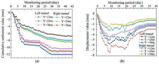 The curves presented in Figure 15a reveal the crown settlement characteristics of both tunnels at specific chainages. Overall, the settlement magnitude of the left tunnel consistently exceeds that of the right tunnel. At the Y = 24 m monitoring cross-section, the left tunnel exhibits a maximum settlement value of 12.03 mm, which remains within the specified control threshold of 20 mm.