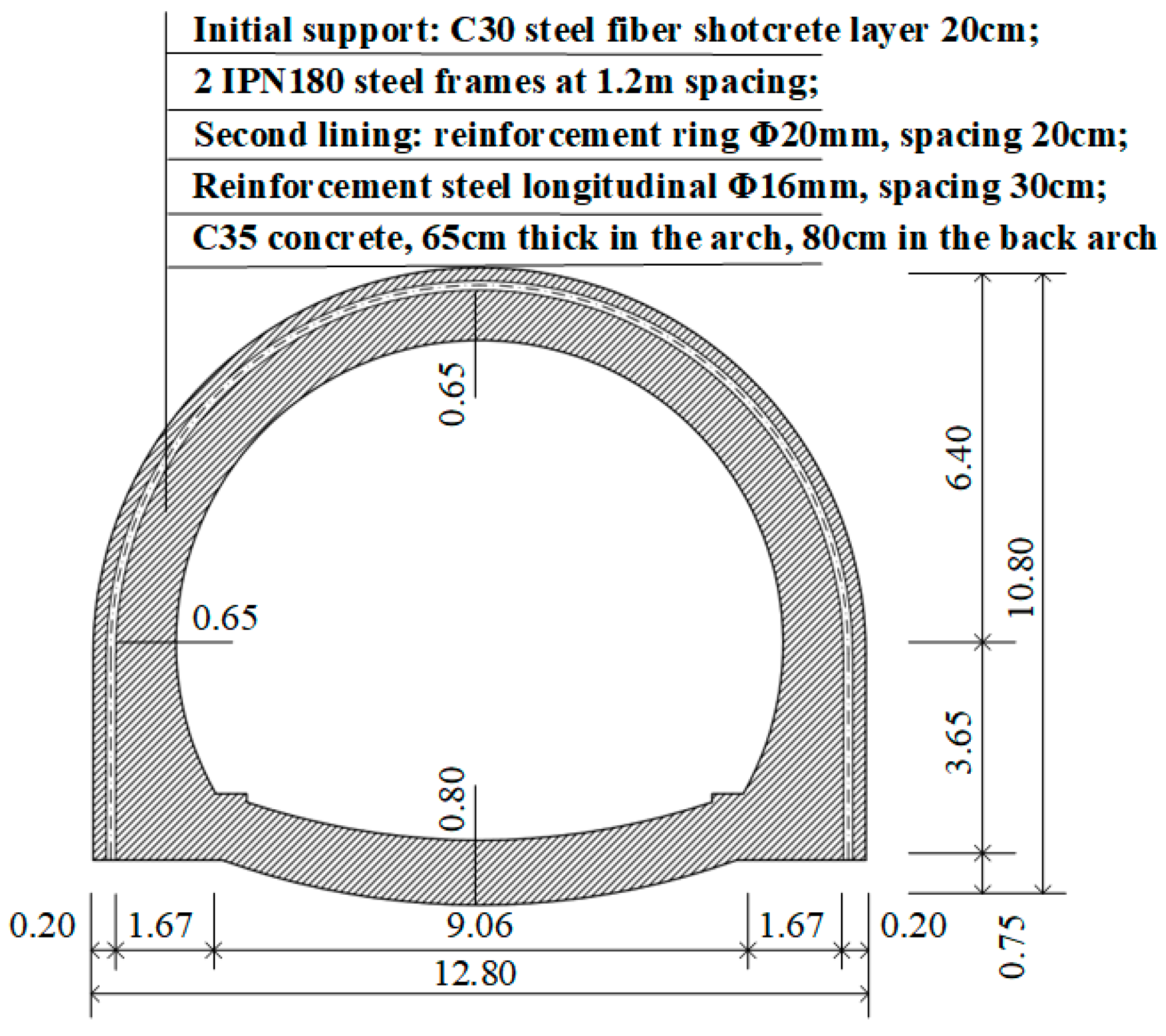 In the tunnel portal section, the primary support consists of a 0.2 m thick layer of C30 steel-fiber-reinforced shotcrete combined with double IPN180 steel arches spaced at 1.2 m. The secondary lining employs C35 reinforced concrete, with thicknesses of 0.8 m at the invert and 0.65 m at the crown. Assuming