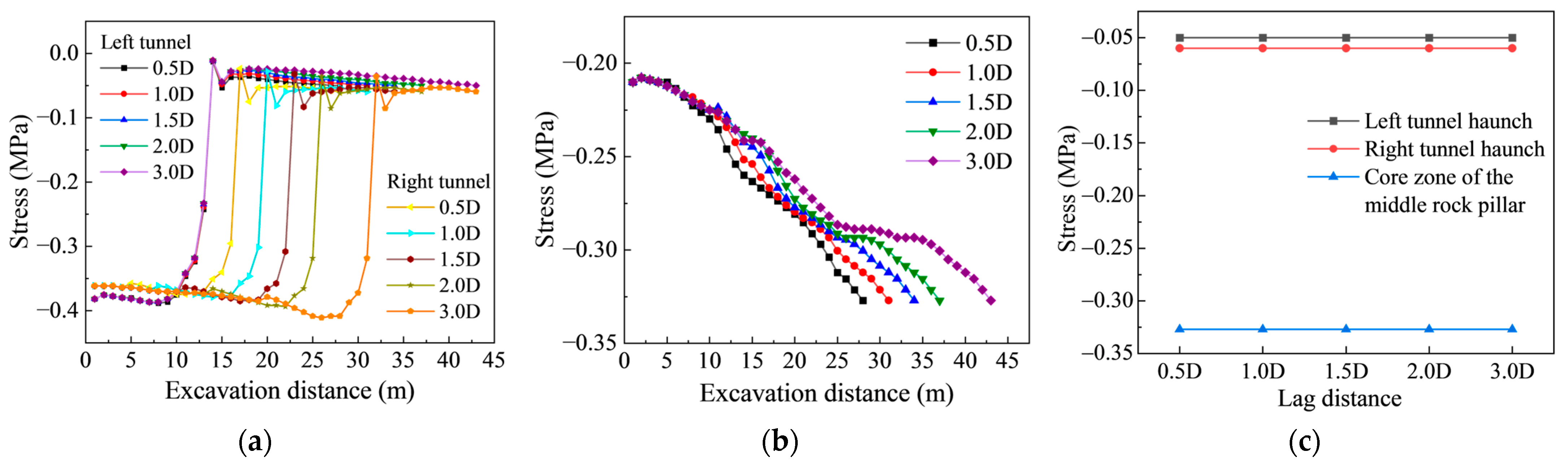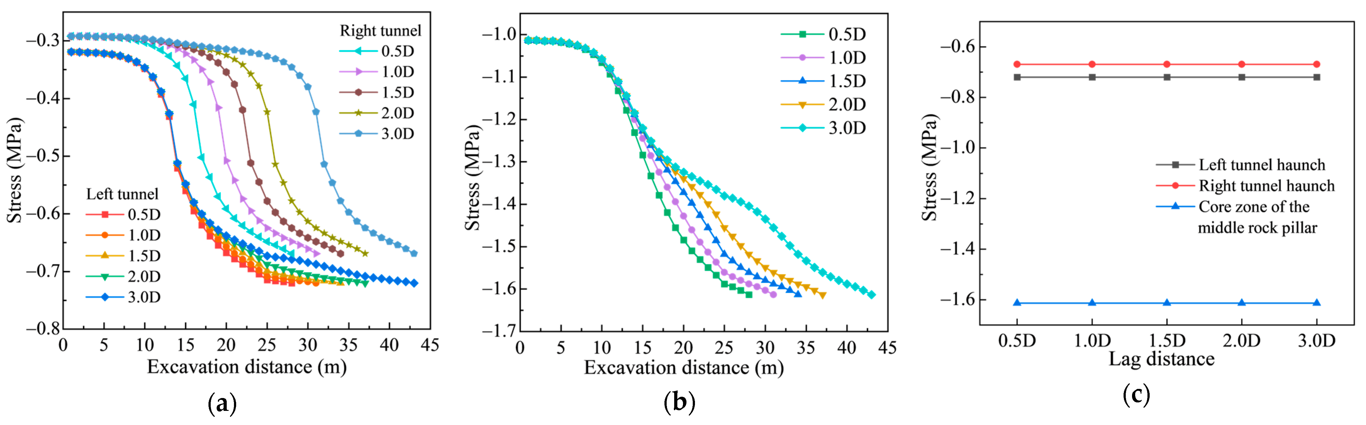 24] further observed that crown settlement and support forces are highly sensitive to face lag distance and are generally greater than those in single-tunnel conditions. Hence, face lag distance not only governs the spatial–temporal coupling between adjacent tunnels but also determines the stress transfer efficiency of the middle rock pillar.