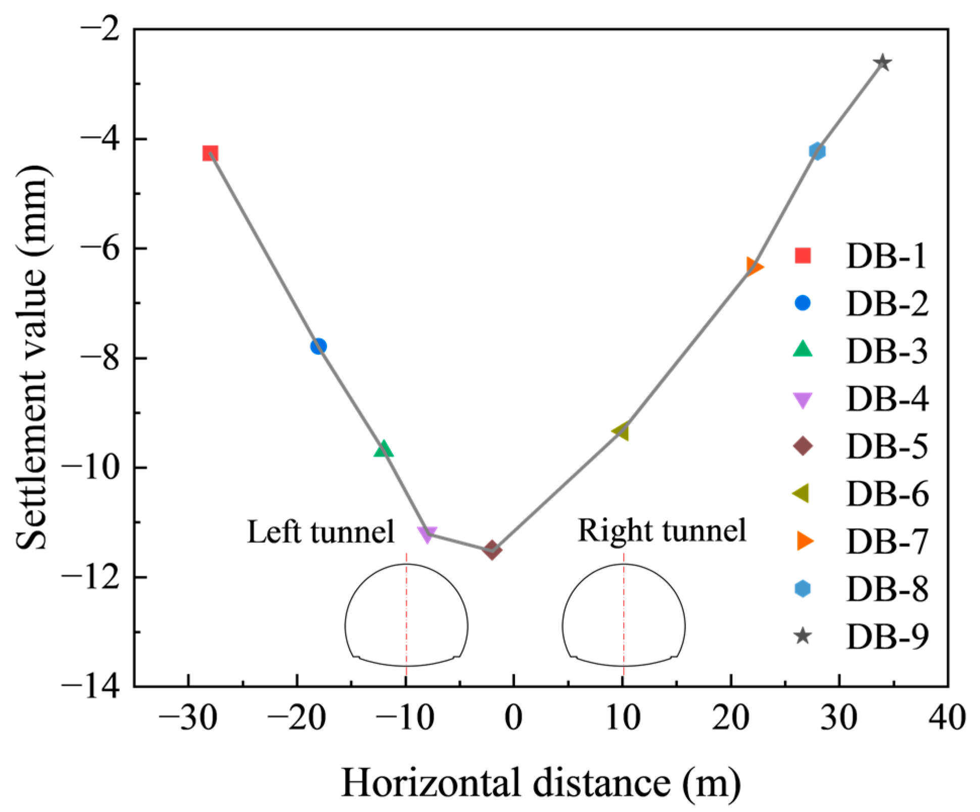 | Ground surface settlement | DB-1 | 4.26 | 2.19 |