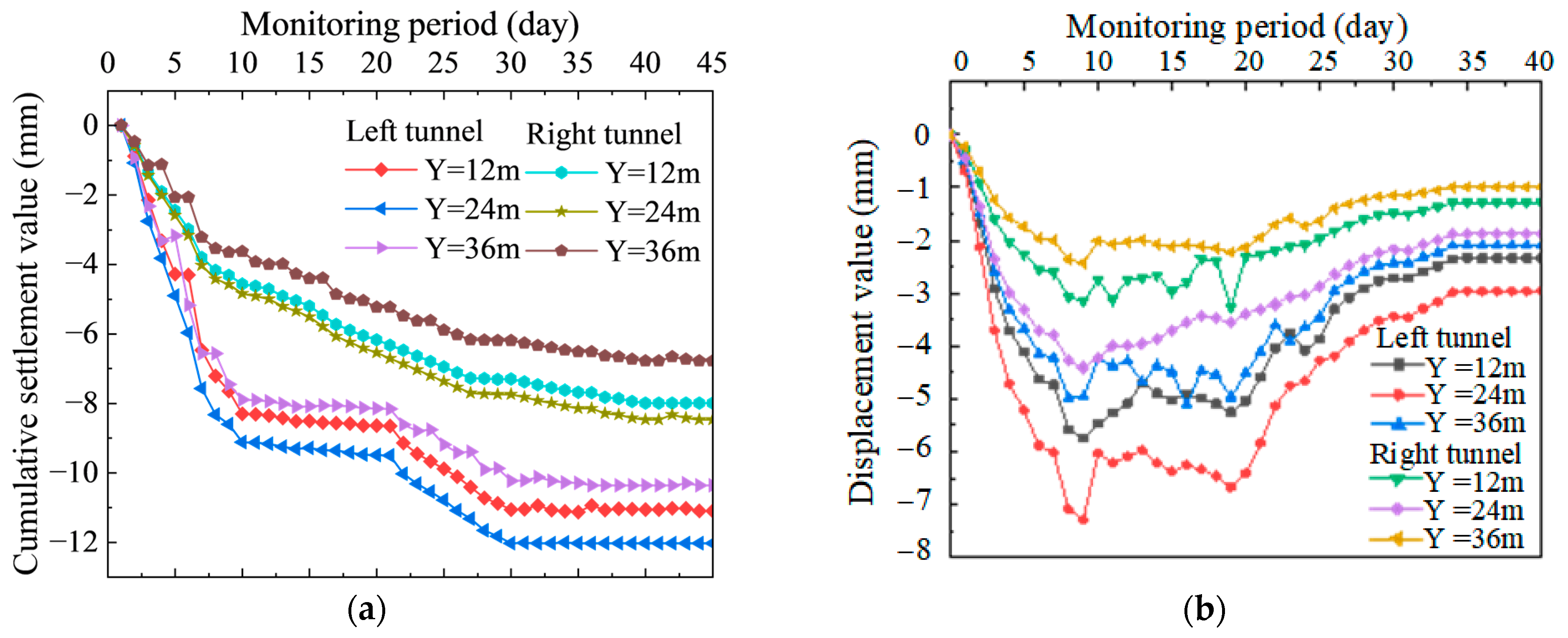 Deformation curves of monitoring cross-sections of the left and right tunnels. (a) Crown settlement curves; (b) Haunch convergence curves.