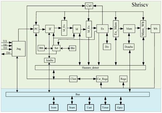 With the rapid advancement of microelectronics and integrated circuit technologies, embedded processors have gained widespread adoption across telecommunications systems, industrial control, medical devices, consumer electronics, and smart home applications due to their significant advantages of compact size, high energy efficiency, and exceptional flexibility [1,2]. In the embedded computing domain, the ARM architecture has evolved over many years into a highly mature ecosystem. However, these traditional processor architectures are constrained by patent protections, requiring developers to pay substantial licensing fees for patents and architecture usage. Furthermore, due to their early development, these architectures have grown increasingly complex in design and struggle to adapt to diverse application demands. They lack a unified instruction set architecture capable of meeting the modern semiconductor industry’s requirements for customization, differentiation, and high performance [3,4,5,6]. In recent years, the RISC-V architecture has rapidly gained prominence in the industry due to its open instruction set and streamlined design philosophy [7,8]. Compared to the ARM architecture, RISC-V demonstrates significant potential in power consumption control, instruction set scalability, and ecosystem flexibility, and is gradually being adopted in critical fields such as embedded systems and the Internet of Things [9]. As an emerging instruction set architecture, RISC-V offers numerous advantages, such as modular design, streamlined instruction set, full open-source nature, and high scalability [10,11,12]. These advantages enable users to flexibly develop and customize solutions according to specific requirements. As the RISC-V software ecosystem continues to mature, an increasing number of enterprises and research institutions are adopting the RISC-V architecture for processor development. For example, in 2015, SiFive launched the first customizable RISC-V SoC platform, FreedomE300 [13], and in 2016, introduced a specific SoC named Freedom E310 SoC [14], configured based on the Freedom Everywhere E300 platform. The Freedom E310 SoC was the first commercially available RISC-V-based SoC. To date, SiFive’s standard cores remain the most widely adopted RISC-V solutions globally across multiple sectors. In July 2020, the National University of Defense Technology unveiled achievements from its “One Student One Chip (ysyx)” plan initiative: five undergraduates independently designed a 64-bit RISC-V processor, completed SoC assembly, achieved production manufacturing, and successfully ran the Linux operating system on the SoC [15]. These accomplishments fully demonstrate the immense potential of the RISC-V architecture in embedded and high-performance computing domains.