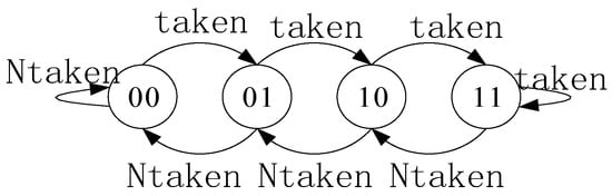 The state transitions of the 2-bit saturated counter are illustrated in Figure 2. 00 indicates a strong no-branch, 01 indicates a weak no-branch, 10 indicates a weak branch, 11 indicates a strong branch, taken denotes an actual branch occurrence, and Ntaken denotes an actual no-branch.