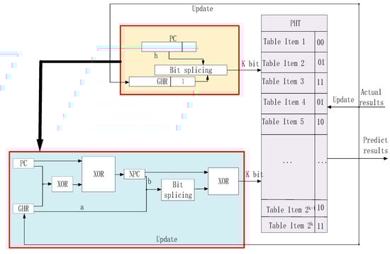 In the Gselect branch predictor architecture, the high-order bits of the program counter are simply concatenated with the low-order bits of the branch history register, then truncated to K bits to index the PHT. This approach fails to fully utilize the low-order bits of the program counter, causing the branch predictor to assign the same PHT index value to instruction sequences with similar high-address patterns. This triggers address mapping conflicts in the prediction table—known as branch aliasing—ultimately degrading Gselect’s branch prediction accuracy [31]. To resolve this, this paper proposes a branch prediction architecture based on TXOR-Gselect (Two-level branch predictor). This structure effectively mitigates the inherent branch aliasing issue in the Gselect architecture, thereby enhancing branch prediction accuracy. Its specific structure is illustrated in Figure 3.