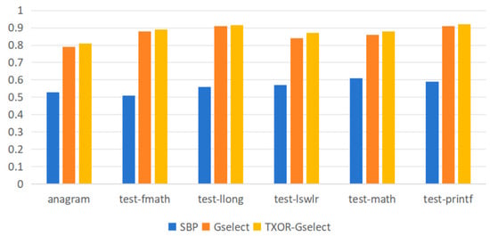 As shown in Figure 4, the TXOR-Gselect branch predictor outperforms the original Gselect predictor. Under a GHR length of 12, its average prediction accuracy reached 88.02%, representing a 1.47 percentage point improvement over the Gselect predictor’s 86.55%, demonstrating superior branch prediction capability. The branch predictor is integrated into the instruction fetch stage, with a fixed one-cycle latency. The pattern history table and branch target buffer capacities are set to 1024 entries and 512 entries, respectively, aligning with typical hardware resource constraints in embedded scenarios. The cache size is 64 KB with a 5-cycle hit latency. In the test program, the baseline Gselect predictor achieved an average IPC of 0.75, while integrating the TXOR predictor increased the average IPC to 0.762. Although this absolute performance gain may appear modest, it must be considered against the backdrop of Gselect’s already high baseline performance. Crucially, implementing TXOR-Gselect requires only a minimal addition of XOR operations to Gselect’s indexing logic, resulting in hardware overhead that is virtually negligible compared to Gselect. This performance improvement achieved at near-zero cost demonstrates the practicality and efficiency of our approach.