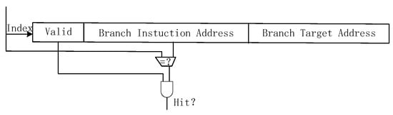 The Target Address Buffer Table is a storage unit composed of multiple table entries, essentially functioning as a cache structure. To balance prediction accuracy and hardware overhead, the table size is set to 512 entries. Each entry comprises three primary components: the Valid bit, the Branch Instruction Address, and the Target Address. The BTB prediction process, illustrated in Figure 5, uses the branch instruction to index the table entries. It compares the branch instruction address with the stored branch instruction addresses in the table. If a hit occurs and the corresponding entry’s Valid bit is set to true, the jump target address is extracted from that entry as the predicted address. This address is then passed to the PC fetch module to serve as the fetch address for the next instruction. This mechanism effectively reduces pipeline stalls caused by branch instructions by rapidly providing the jump target address, thereby enhancing the processor’s fetch efficiency.