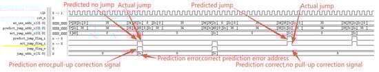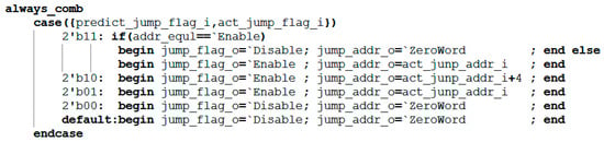 The core design of this module is a combinational logic circuit, whose decision logic is based on four possible combinations of the predicted branch signal (predict_jump_flag_i) and the actual branch signal (act_jump_flag_i). First, it determines whether the predicted address equals the actual address. Subsequently, it combines the two jump flags via a case statement to ultimately generate the jump control signal. addr_equal determines whether the predicted jump address matches the actual jump address. It remains high (1) if they match and goes low (0) if they differ. The signals involved in this module are shown in Table 3. Its core decision logic is represented as follows: When both prediction and actual jumps occur and addr_equal is high (1), the module determines that the prediction is correct. It does not pull the correction signal (jump_flag_o) high and requires no jump address correction (jump_addr_o). If both indicate a jump and addr_equal is 0, it is deemed a prediction error; the correction signal is pulled high, and the jump address is corrected. When a predicted jump occurs but the actual jump does not, it constitutes a prediction error; the correction signal is pulled high, and the jump address is corrected to PC + 4 to guide the pipeline back to the correct path.