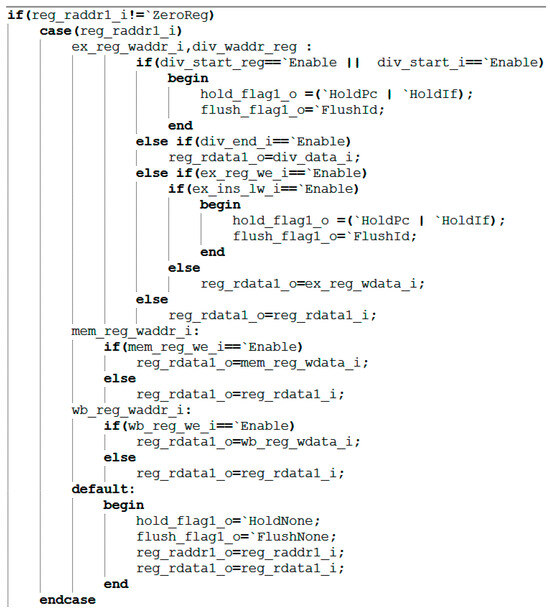 During the execution phase of each instruction, the system performs dependency checks (signals involving data dependencies within the module are shown in Table 4): It compares the RS1 address of the current instruction (reg_raddr1_i in Figure 7) with the target register address of the execution stage (ex_reg_waddr_i in Figure 7), the division register address (div_waddr_reg in Figure 7), the memory access stage register address (mem_reg_waddr_i in Figure 7), and the write-back stage register address (wb_reg_waddr_i in Figure 7). If the RS1 address matches any of the above addresses, the system prioritizes forwarding the precomputed data to the required stage. The detailed workflow is as follows: First, if RS1 is the zero register (x0), the zero value is returned directly. Second, perform the highest-priority execution and division unit checks: if a division operation is in progress, halt the front end and clear the decode stage; if the division completes within the current cycle, pass its result to RS1. Third, if an execution-level instruction requires writing to the same register, further checks occur: for load instructions, similarly, halt the front end and clear the decode stage; if it is a non-load instruction, the execution stage result is directly propagated. Subsequently, the module sequentially checks the memory access and write-back stages. If a valid write register operation exists, the corresponding data is propagated. If none of the above propagation conditions are met, the original data is ultimately read from the register file as the operand value.