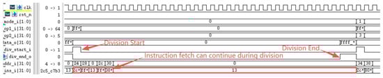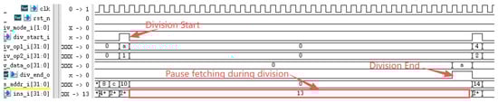 The RISC-V International Foundation provides a set of instruction set test programs to verify whether RISC-V processor implementations comply with the specification. Its primary purpose is to validate whether the instructions supported by the designed processor have been successfully implemented. Testing the processor core using these instruction set test programs revealed that the optimized processor performed exceptionally well in the instruction set tests. Figure 9 reveals a performance bottleneck in the prototype processor during division operations: regardless of data dependency, the processor must halt the pipeline until the division completes before fetching the next instruction. After implementing division optimization based on data dependency, as shown in Figure 10, the improved processor can continue fetching instructions while executing division operations, significantly enhancing instruction fetch speed. Under ideal conditions, division calculations no longer require pipeline stalls, saving 33 clock cycles (division operations take 33 clock cycles). The reduction in division computation time amounts to 100%. Regarding branch prediction, Figure 11 demonstrates that the proposed dynamic branch predictor efficiently forecasts jump addresses. Figure 12 further validates that when prediction results diverge from actual jump paths, the prediction error correction module promptly restores processor state, ensuring correct instruction stream execution. Additionally, experimental data in Figure 13 indicates that the SHriscv processor significantly enhances memory access rates by integrating cache modules and peripheral device interfaces.