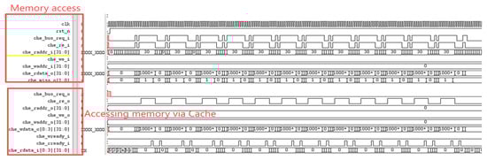 Figure 8 illustrates the storage architecture of this paper, employing a custom bus to connect the processor and peripheral devices. A UART module is implemented to facilitate the output of program execution results. In the cache design, its capacity is set to 32 kB, with each way containing 64 cache lines. A four-way set-associative mapping strategy is adopted to balance cache hit rate and hardware overhead. The four-way set-associative design effectively reduces cache conflicts and enhances data access efficiency. The replacement algorithm abandons the traditional Least Recently Used (LRU) strategy in favor of a pseudo-LRU algorithm to conserve resources. This design also supports cache enable/disable functionality. When disabled, the processor core can directly access memory via the custom bus, requiring 19 clock cycles for memory access. When enabled, memory access requires only one clock cycle, significantly reducing processor memory access latency.