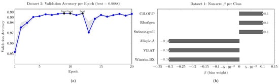 (a) The epoch-wise validation accuracy curve for the Fusion Malware dataset. (b) The per-class logit biases learned on the validation set for the Malimg snapshot-ensemble.