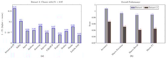 Figure 2b contrasts dataset 1 (Malimg) with dataset 2 (Fusion) on four metrics and reveals a consistent 1% absolute performance gap favoring Malimg: accuracy vs. , Macro Precision vs. , Macro Recall vs. , and macro F1 vs. . This pattern indicates that, beyond overall accuracy, the class-averaged precision/recall balance is uniformly stronger on Malimg, consistent with its smaller family set and the use of snapshot-ensembling plus bias calibration. Conversely, Fusion’s larger label space and higher heterogeneity create more opportunities for per-class degradation, which pulls down the macro averages. Notably, on both datasets the Weighted-F1 (Malimg ; Fusion ) tracks overall accuracy closely, implying that large/support-rich families dominate the global score while macro metrics remain sensitive to smaller or harder families—an effect more pronounced in Fusion. The macro gap on Fusion is well explained by the error-hotspot analysis, where a handful of families (e.g., Swizzor.gen!I, Sality, and Autorun) exhibit notably lower F1 than the cohort median. The concentration of errors suggests that targeted remedies—like class-aware augmentation, calibrated thresholds, or small per-class logit adjustments—could significantly improve macro metrics without greatly altering strong model families. For Malimg, small per-class biases (with ()) enhanced validation performance and maintained ranking, providing a low-risk method for adjusting decision thresholds. Given Fusion’s macro shortfall is driven by a few outliers, the same tactic—applied sparingly to those classes—could close part of the macro gap without retraining or full ensembling (and can be combined with post hoc threshold tuning for precision/recall trade-offs).