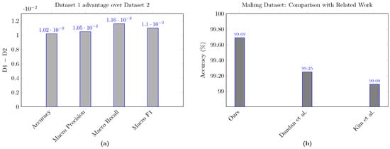 Figure 3a visualizes the absolute margin by which our method did very well on Malimg compared to Fusion across four evaluation metrics. The gaps are uniformly about one percentage point, with the largest on Macro Recall (), followed by macro F1 (), Macro Precision (), and accuracy (). The prominence of the recall gap indicates that Fusion’s harder/rarer families depress class-averaged sensitivity more than they affect global accuracy, consistent with the error-hotspot analysis and the larger label space/heterogeneity in the Fusion Malware dataset. Methodologically, the margin also reflects pipeline differences: Malimg benefits from snapshot ensembling, eight-view TTA, and per-class bias calibration, whereas Fusion uses a single best checkpoint without post hoc class-wise offsets; this combination plausibly elevates Malimg’s macro metrics, especially recall.