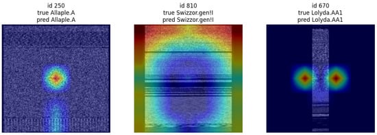 Figure 4 illustrates Grad-CAM overlays for three representative samples—Allaple.A, Swizzor.gen!I, and Lolyda.AA1—demonstrating how the proposed model attends to distinctive structural regions when making classification decisions. In the Allaple.A example, the activation is focused on the core image pattern, showing that the model uses key regions for accurate predictions. The Swizzor.gen!I heatmap exhibits broader attention across horizontal bands, reflecting the family’s polymorphic variability while still achieving correct classification. For Lolyda.AA1, attention centers on two symmetric hotspots along the vertical axis, highlighting the unique structural cues that differentiate this family. The illustration shows how cross-attention fusion identifies important structural patterns and reduces irrelevant background noise, allowing the model to focus on crucial aspects of malware. In the future, we will examine other explainable AI (XAI) methods, like shapley additive explanations (SHAP), to increase trust and transparency for data analysts.