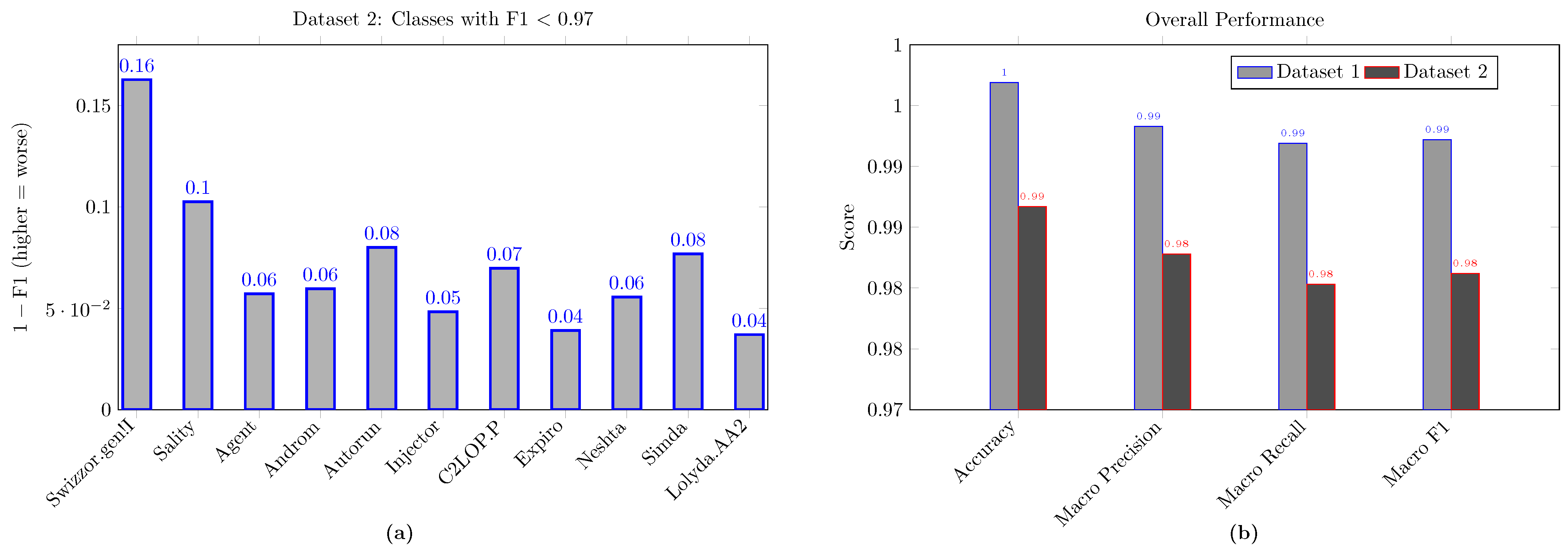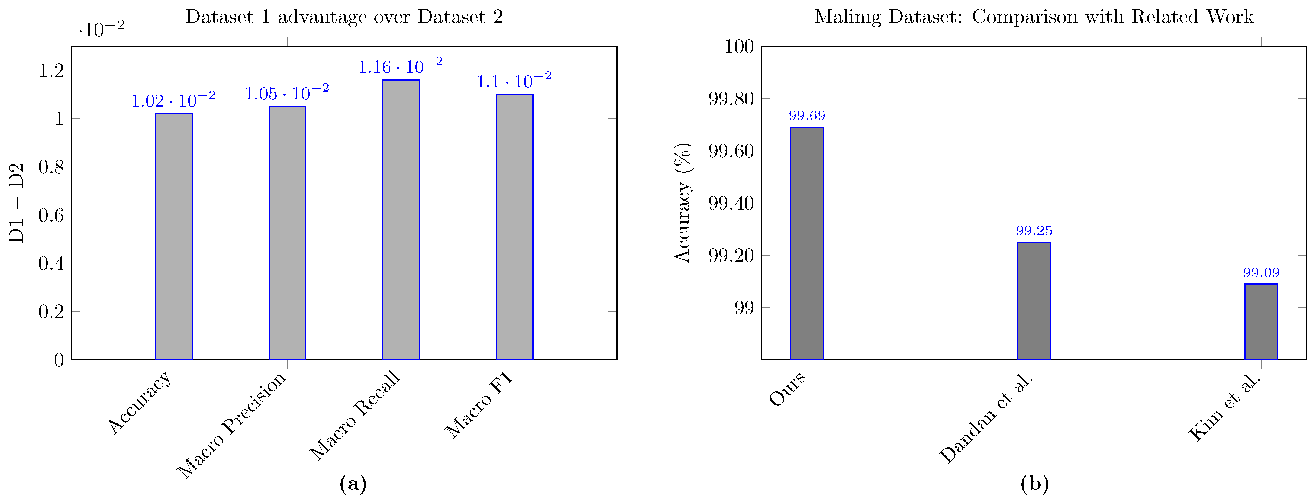 Figure 2b contrasts dataset 1 (Malimg) with dataset 2 (Fusion) on four metrics and reveals a consistent 1% absolute performance gap favoring Malimg: accuracy