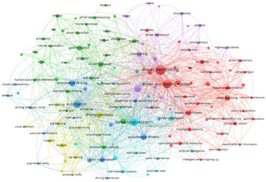 Following the initial screening process, which involved the removal of documents primarily focused on autonomous vehicles rather than driver monitoring, a second bibliometric analysis was performed using VOSviewer software. This analysis centered on author keywords to effectively capture the themes that researchers emphasize and the specific areas of focus within the literature. A threshold of two occurrences was applied, narrowing the mapping down to 45 keywords. This process resulted in the visualization depicted in Figure 5, created with a clustering resolution of 1.0.