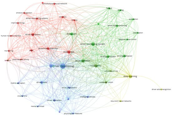 The landscape map is organized into four main clusters. The most prominent cluster, depicted in blue, centers around driver monitoring. The green cluster concentrates on the advancement of DMSs and associated tools, such as adaptive controls, HMIs, computer vision, and driving simulators. This cluster emphasizes the safety of both drivers and passengers as the primary motivation for its focus. The red cluster encompasses the key aspects of the driver’s state, with particular attention to drowsiness and emotional well-being. Lastly, the smaller yellow cluster is dedicated to Deep Learning.