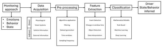 Once the monitoring approach has been defined, it is necessary to determine the type of information that will be collected from the driver and the surrounding context. This information can generally be classified into two categories: Direct Monitoring: Refers to data obtained directly from the driver, usually through sensors or vision-based systems [18]. Examples include eye-tracking cameras, EEG, electrocardiography (ECG) [19], facial expression analysis, or steering wheel sensors [20] that capture physiological and behavioral signals. These methods aim to provide accurate insights into the driver’s state, such as drowsiness, distraction, stress, or cognitive load [21].
