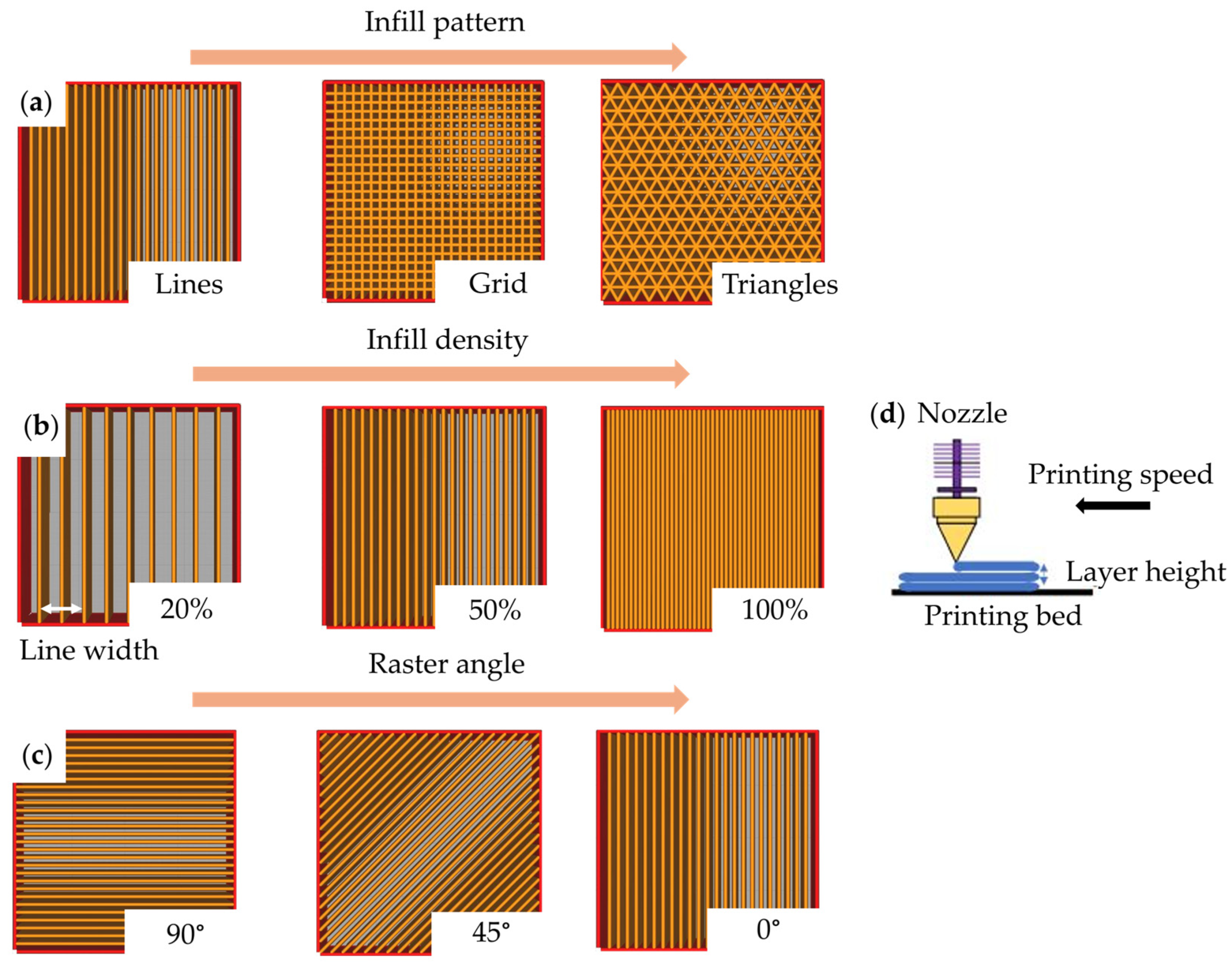 - Gonabadi, H.; Chen, Y.; Yadav, A.; Bull, S. Investigation of the effect of raster angle, build orientation, and infill density on the elastic response of 3D printed parts using finite element microstructural modeling and homogenization techniques. Int. J. Adv. Manuf. Technol. 2022, 118, 1485–1510. [Google Scholar] [CrossRef]