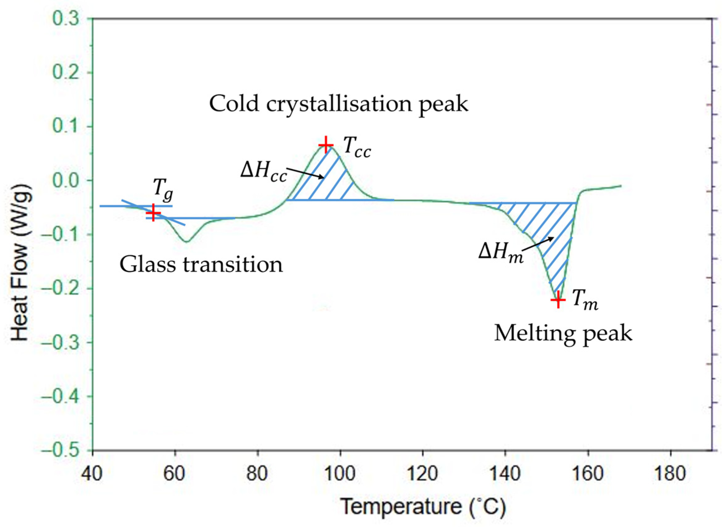 - Solarski, S.; Ferreira, M.; Devaux, E. Characterization of the thermal properties of PLA fibers by modulated differential scanning calorimetry. Polymer 2005, 46, 11187–11192. [Google Scholar] [CrossRef]