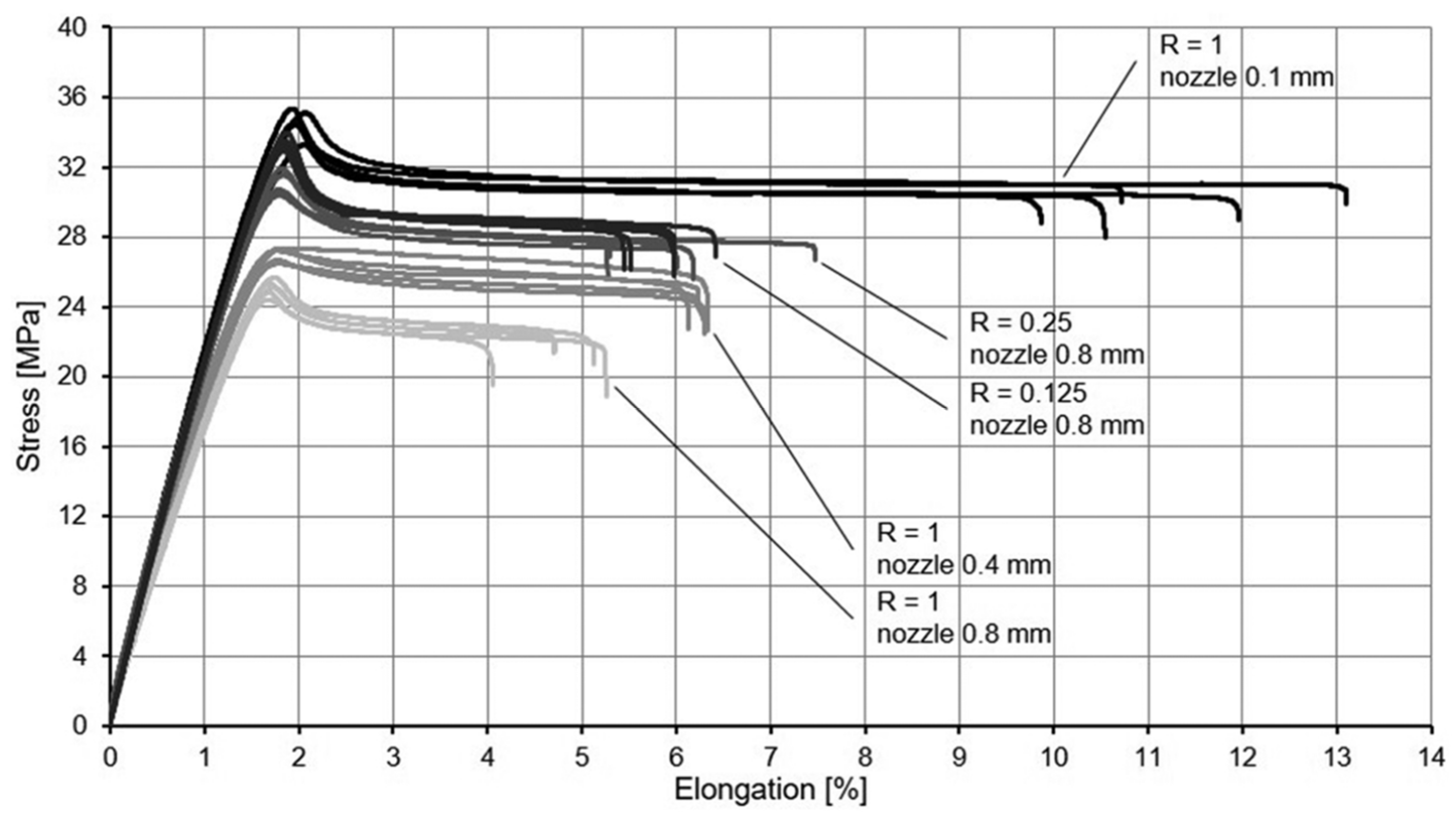 - Fischer, D.; Eßbach, C.; Schönherr, R.; Dietrich, D.; Nickel, D. Improving inner structure and properties of additive manufactured amorphous plastic parts: The effects of extrusion nozzle diameter and layer height. Addit. Manuf. 2022, 51, 102596. [Google Scholar] [CrossRef]