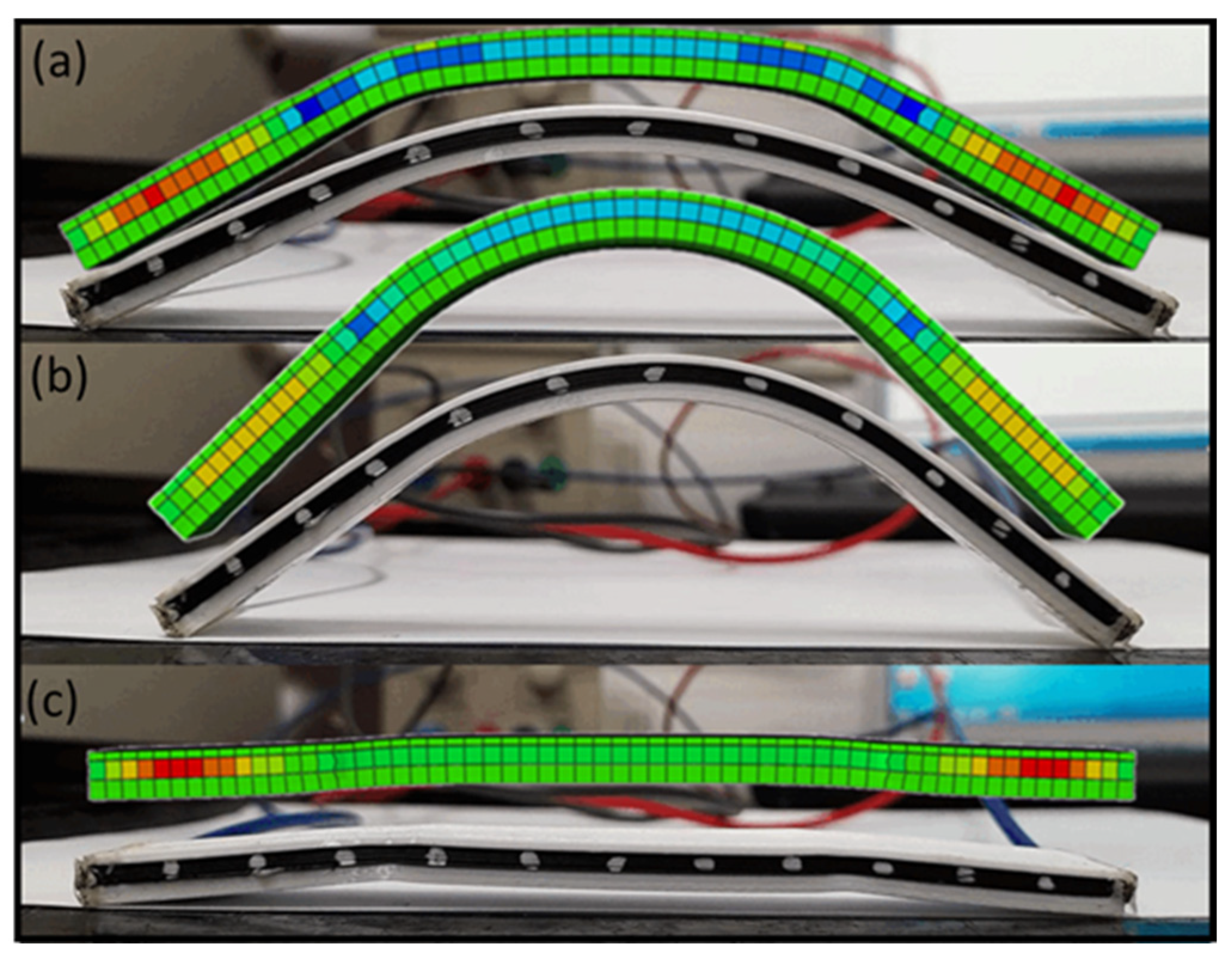 - Delbart, R.; Robert, C.; Truong Hoang, T.Q.; Martinez-Hergueta, F. Development of an electro-thermo-mechanical 4D printed multi-shape smart actuator: Experiments and simulation. Compos. Part Appl. Sci. Manuf. 2024, 186, 108381. [Google Scholar] [CrossRef]
