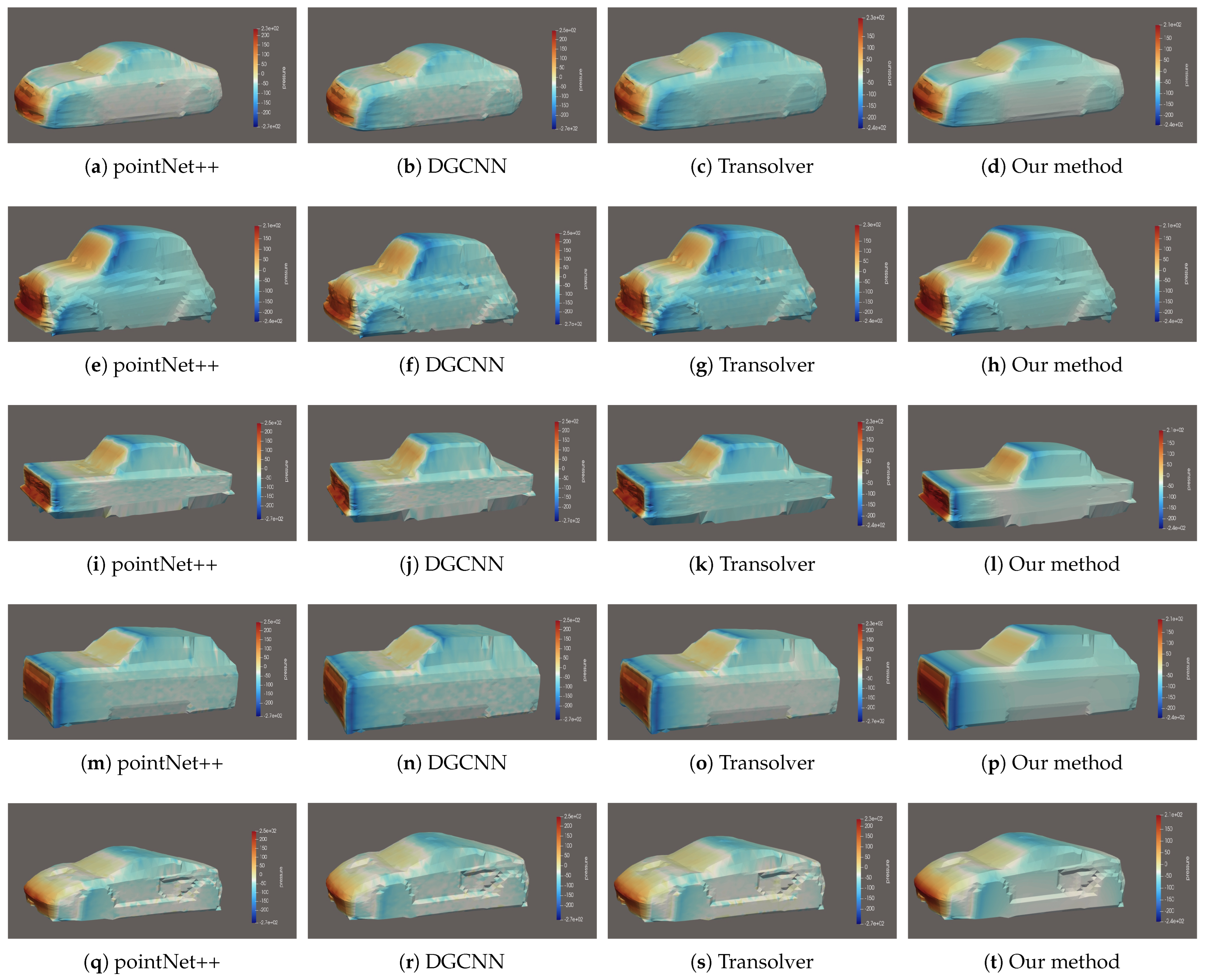 - Inference Phase: The primary advantage of our data-driven approach is its exceptional inference speed. Once the model is trained, it can predict the surface pressure coefficient () field for a new, unseen vehicle geometry in a single forward pass. This process takes approximately 1.5 s.