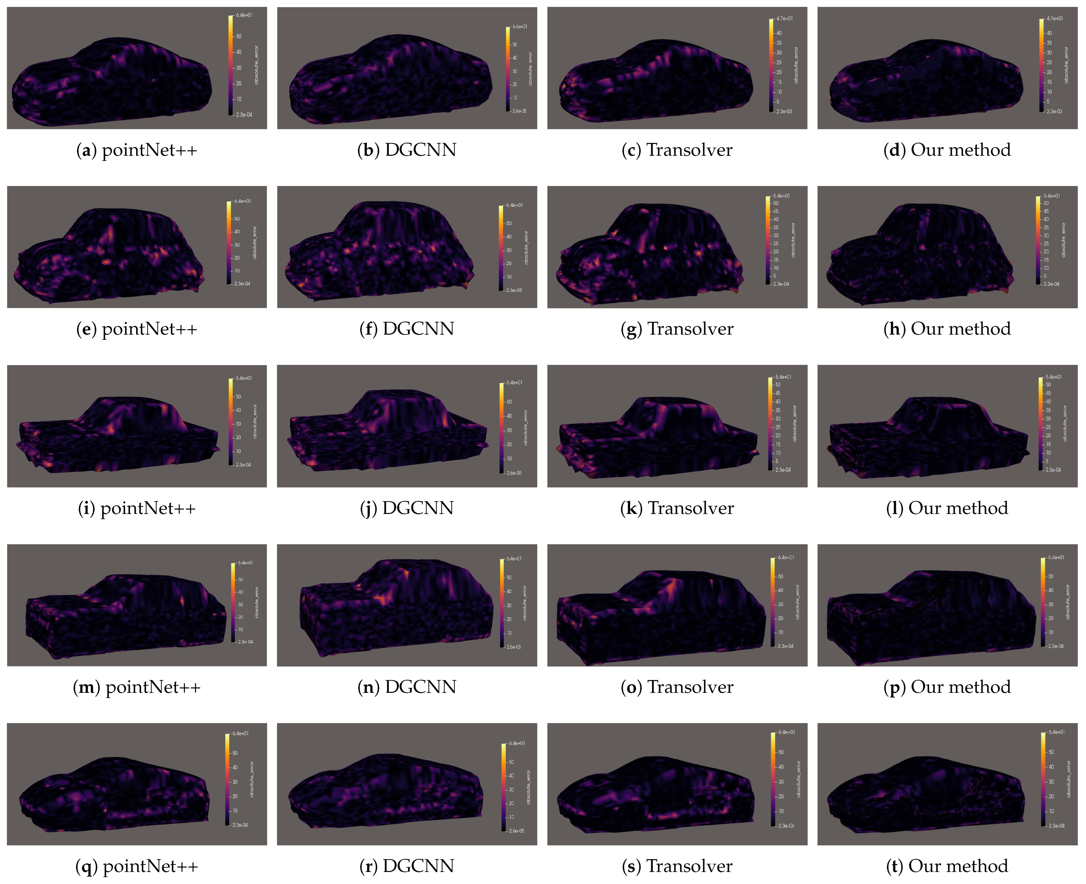 - Comparison with Traditional CFD: The efficiency of our model becomes evident when compared to the traditional physics-based simulation used to generate our ground truth data. A single high-fidelity CFD simulation for one vehicle requires about 17 h of computation on a 128-core High-Performance Computing (HPC) cluster.