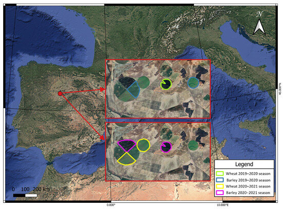 The experimental crops were irrigated winter wheat (Triticum aestivum L.) and barley (Hordeum vulgare L.) sown in mid-November. Specifically, in the 2019–2020 season, a field of 13.3 ha of wheat and two fields of barley with a total cultivated area of 30.66 ha. In the following season, the cultivated surface of wheat was 42 ha, distributed in two fields, while 34 ha of barley, distributed in two fields, were cultivated (Figure 1).