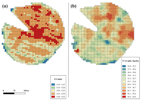 (a) Potential grain yield index (EY index) and (b) applied second N coverage () of the wheat field studied in the 2019–2020 season.