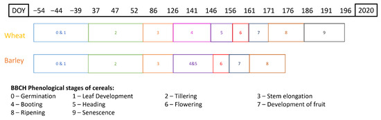 The phenological stages were determined by studying the evolution of Sentinel-2 reflectance bands [23,24,25] in crops throughout their productive cycle and through onsite verifications. In this way, Figure 4 shows an approximation of the phenological cycle of crops, classified using the BBCH scale [26].