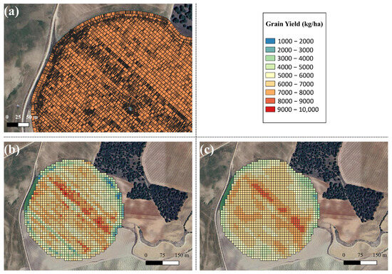 (a) Yield map generated by the combine, (b) yield map after applying the global and local adjustment with the spatial resolution of Sentinel-2 data ( 10 m), and (c) final yield map after applying the global and local adjustment and the mean filter resampled to the higher spatial resolution of Sentinel-2 data ( 10 m).