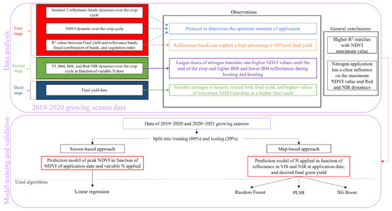 Figure 6 shows the workflow followed to determine the appropriate moment of application of a second N coverage, the effect of different N doses in the crop, and the training and validation of the models for both studied approaches of VRT N fertilization. As presented in the workflow (Figure 6), the data analysis was carried out using only the data from the 2019 to 2020 growing season, while data from both studied growing seasons (2019–2020 and 2020–2021) were used for the model training and validation.