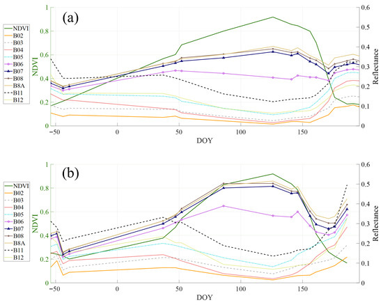 Temporal evolution of NDVI and reflectance across Sentinel-2 spectral bands for (a) wheat and (b) barley during the 2020–2021 growing season. DOY stands for Day of Year, with negative DOY values indicating days prior to the start of the 2020–2021 season.
