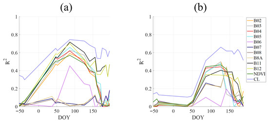 Temporal evolution of R2 between yield and Sentinel-2 reflectance bands, the lineal combination of all bands (CL) and NDVI in (a) wheat and (b) barley for the 2019–2020 season. DOY stands for Day of Year, with negative DOY values indicating days prior to the start of the 2019–2020 season.