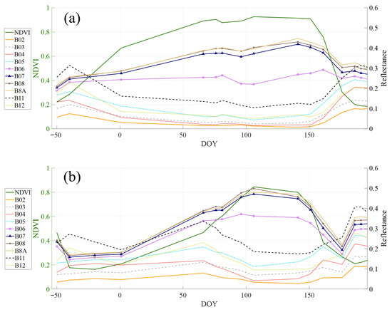 Temporal evolution of NDVI and reflectance across Sentinel-2 spectral bands for (a) wheat and (b) barley during the 2019–2020 growing season. DOY stands for Day of Year, with negative DOY values indicating days prior to the start of the 2019–2020 season.
