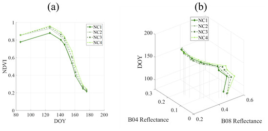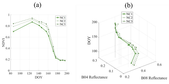 A higher dose of nitrogen results in statistically significantly higher NDVI values (DNS), which occur until the end of the wheat crop (Figure 10a). However, the initial slope after the second coverage application, between 86 and 126 DOY, was higher as the applied amount was smaller, having NC1 of 0.4%, NC2 of 0.3% and NC3 of 0.2%. Moreover, from 141 DOY, the decrease in NDVI values is faster the lower the amount of N received by plants, as can be seen after looking at the slope between 141 and 156 DOY (NC1 has a slope of −0.7%, NC2 of −0.4% and NC3 of −0.3%). On the other hand, B04 reflectance values are statistically significantly higher (DNS) the lower the amount of N received by the plant, while B08 reflectance increases statistically significantly (DNS) as received N increases. Figure 10b shows that the B04/B08 evolution dynamic follows the same tendency in all the treatments. From 86 DOY, wheat improves its NIR value until it reaches its maximum value, while the red value decreases until reaching its minimum value at 126 DOY. From that time until 171 DOY, NIR values will increase, and red values will decrease. From 171 DOY until the end, NIR values increase due to interferences with soil since the wheat plants have entered ripening and senescence stages when they progressively dry out.
