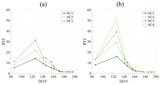 Post-application RVI temporal evolution in (a) wheat and (b) barley crops during the 2019–2020 season. DOY refers to Day Of the Year.