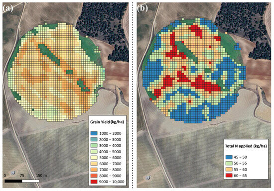 Comparison between (a) final grain yield at the pixel level (10 × 10 m) and (b) applied nitrogen in the second coverage at the pixel level (10 × 10 m) in a field of barley in the 2019–2020 season.