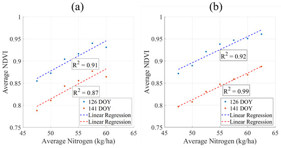 A linear adjustment between NDVI and applied second N coverage was made in 126 and 141 DOY, important moments when not only the NDVI value is maximum but also R2 between yield and reflectance bands and studied VI (Figure 8). In this context, Figure 14 shows that average nitrogen coverage and average NDVI can be linearly adjusted, as no saturation effect is observed in the graphs within the studied N range.