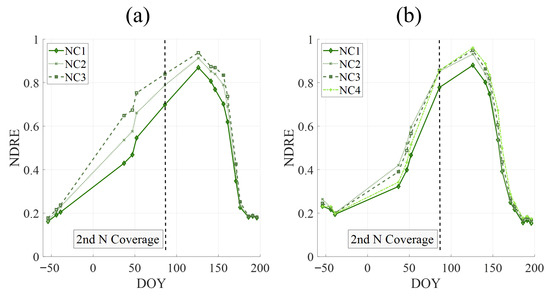 The NDRE evolution was represented (Figure 15a,b). Before the second N coverage application in both crops, the plants receiving more N due to their higher productive potential had a higher NDRE value. After the treatment, the plants with higher NDRE continued to have a better NDRE. Nevertheless, the treatments with intermediate doses of N (NC2 and NC3) showed similar NDRE, indicating an increase in N presence in the plants.