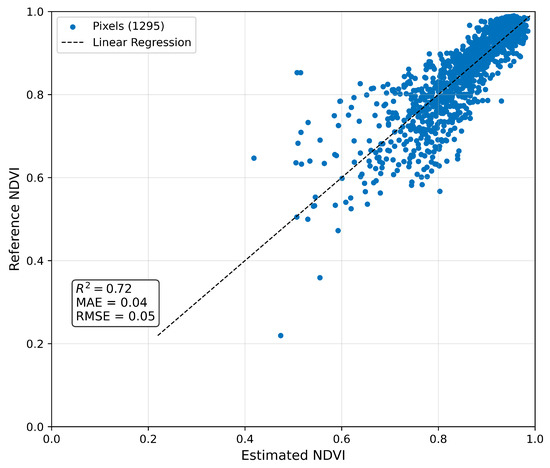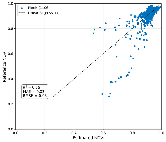 Figure 16 shows the linear adjustment between the maximum NDVI (Reference) and the estimated maximum NDVI in the case of wheat. R2 validation was 0.55 ± 0.06, the MAE value was 0.025 ± 0.002, and the obtained RMSE was 0.049 ± 0.007.