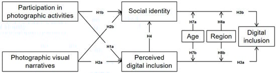 Furthermore, a sequential chain from perceived digital inclusion to social identity is theoretically grounded: trust and ease in the digital environment can reduce identity threats and usage anxiety and improve interaction quality and collective efficacy, thereby reinforcing emotional belonging with respect to digital communities [,,,]. Building on the foregoing literature and theorization, we specify two mediating paths—social identity and perceived digital inclusion—linking photographic activities (including the variables “Participation in photographic activities” and “Photographic Visual Narratives”) to digital inclusion. Specifically, we not only hypothesize that the two mediators exert positive indirect effects on digital inclusion but also infer a sequential chain from “Perceived Digital Inclusion to Social identity”. Once older adults adapt to and trust the digital environment and subsequently attain greater psychological group identification, they tend to be more motivated and willing, in turn fostering a heightened perception of the digital divide narrowing. In sum, we propose the following research hypotheses:
