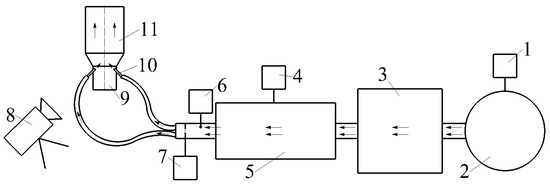 Experimental setup diagram: 1—air consumption management system; 2—compressor; 3—flow equalization receiver; 4—air flow heating level control system; 5—heater; 6—air flow temperature control system (based on a thermocouple); 7—air flow control system (based on a hot-wire anemometer); 8—thermal imager; 9—diffuser base; 10—supply nozzles; 11—diffuser. Note: The arrows indicate the approximate direction of air flow in the system.