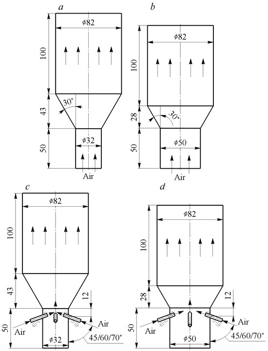 Air was supplied to the diffuser through nozzles for bases with diameters of 32 mm (Figure 2c) and 50 mm (Figure 2d). The main geometric dimensions of the air diffuser remained the same as for the single-duct configuration. The nozzles had an internal diameter of 5 mm and a length of 100 mm. Four nozzles were installed in the base, evenly spaced around the circumference (the angle between the nozzles was 90°). The nozzle angles were 45°, 60°, and 70° relative to the base axis (and diffuser). The choice of nozzle angles was determined by the technical and technological capabilities of the existing laboratory gasifier. The nozzle angles used in the experiments corresponded to those of the flow gasifier built in the university laboratory. Other key dimensions of the VCD with nozzle air supply are shown in Figure 2c,d. The nozzle tube roughness was approximately 3.2 µm.