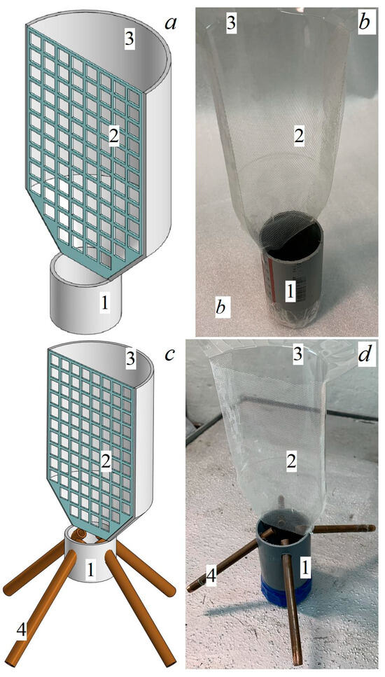 General view and photographs of VCDs: (a)—3D model of a VCD with air supply through a single duct; (b)—photograph of a VCD with air supply through a single duct; (c)—3D model of a VCD with air supply through nozzles; (d)—photograph of a VCD with air supply through nozzles: 1—diffuser base; 2—thermal imaging grid; 3—diffuser; 4—nozzles.