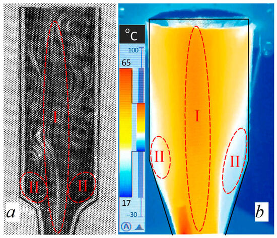 Comparison of flow distribution in a VCD for air supply through a single duct for Re ≈ 20,000: (a)—data [40]; (b)—author’s thermogram. Note: I—main flow; II—stagnation zone.